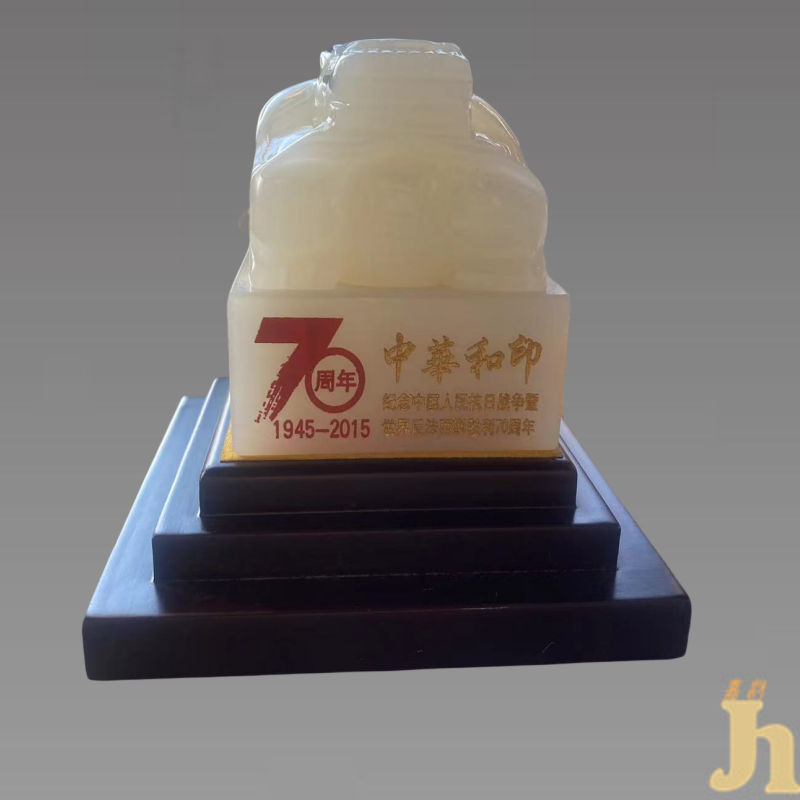 此件藏品该标识以数字“70”符号,时间“1945-2015”,玺身为上品纯天然青白玉,精切细磨,温润天下,体现对中国人民抗日战争暨世界反法西斯战争胜利的庆祝,亦代表中华民族组成的钢铁长城,共同抗敌。为了和平,我们要牢固树立人类命运共同体意识。偏见和歧视、仇恨和战争,只会带来灾难和痛苦。相互尊重、平等相处、和平发展、共同繁荣,才是人间正道。世界各国应该共同维护以联合国宪章宗旨和原则为核心的国际秩序和国际体系,积极构建以合作共赢为核心的新型国际关系,共同推进世界和平与发展的崇高事业。具有较高的收藏价值和文化艺术欣赏价值!