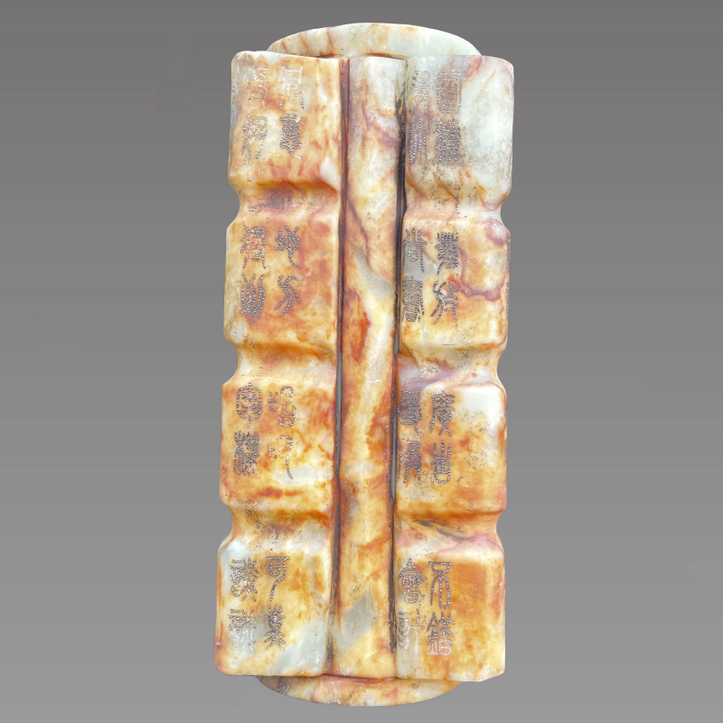 玉琮是一种内圆外方的筒形玉器,为我国古代的重要礼器之一。“琮”始见于《周礼》等古籍。其形以《周礼·考工记·玉人》所释:“大琮十有二寸,射四寸,厚寸”。《白虎通·文质篇》曰:“圆中牙身玄外曰琮”。郑玄补注《周礼》时说:“琮,八方象地”。南唐徐锴释琮时讲:“状若八角而中圆”。后因后人难辨琮状的实体,以致南宋时称为“镇圭”。至清乾隆按东汉许慎《说文解字》,以“琮,瑞玉,大八寸,似车釭?”的说法为据。