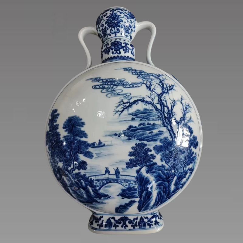 此器短颈,圆溜肩,扁圆腹,胎体坚密,胎质洁白细腻,釉水温润纯净,青花发色纯在,纹饰线条流畅,甁两侧对称型如意耳,全器以青花绘就,圈足底书“大清乾隆年制”六字三行篆书款;口沿外部绘如意云头纹一周,腹部两面开光,绘制不同场景:一面绘湖面上渔船及文人和好友站在桥上对话;另一面绘文人和朋友到家门口,渔船即将靠岸的画面,其余边饰为青花缠枝花卉纹,画法极重工笔各传统精妙手法,构图由远而近,由大到小,将虚实透视空间处置得恰如其分,是工笔绘画的绝佳作品。造型高雅隽美,青花呈色艳丽,釉色莹润,纹饰线条流畅,充分展示了清代许之衡在《饮流斋说瓷》中所形容:“至乾隆,精巧之至,几于鬼斧神工”,气势恢宏雄伟,古雅端庄。具有较高的收藏价值和文化艺术欣赏价值!