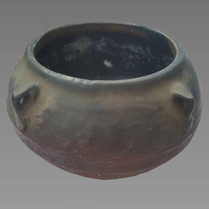 罐口微撇,短颈,丰肩,鼓腹,平底。肩部设置四个系用于穿绳。黑灰色胎,釉色黑褐色,底部露胎。通身施黑釉,釉厚,釉面光润,乌黑发亮,犹如漆器。胎质坚硬致密,色灰黑。此器形规整,罐胎体厚重坚实,造型罕见。工艺纯熟精湛,保存至今,实属不易。具有较高的收藏价值和文化艺术欣赏价值!