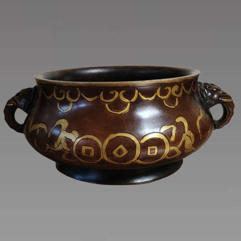 此藏品取精铜铸造,鎏金浑厚,雕饰象作耳,胎体厚实,底部落款“大明宣德年制”六字三行楷书款,图案清晰,造型典雅,大气磅礴,显得整体造型更加挺拔高贵。象耳炉之器型,取「太平有象」之意,寓意吉祥,宫廷气息十足。整体保存良好,巨耳饱满,长鼻力度十足,象牙支出,威武严整。具有较高的收藏价值和文化艺术欣赏价值!