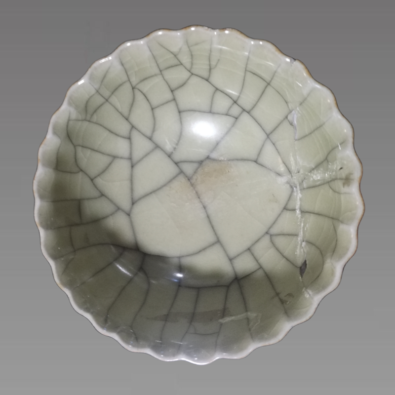 此碗敞口,弧壁,浅圈足。里外满饰青釉,釉厚润如脂。釉面布满细碎的开片纹,深浅不一,如网如织,深纹片呈黑色,浅纹片呈黄色,俗称“金丝铁线”纹。中国古代艺术家和陶瓷工匠在设计陶瓷造型时,善于从大自然动、植物中获得灵感,蛙形、虎形、葵花形、菊花形等造型屡见不鲜。这件菊瓣碗造型规整,青灰色釉素裹,交织如网的开片纹妙趣天成,具有较高的收藏价值和文化艺术欣赏价值!