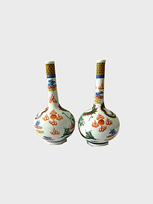 这是一对粉彩龙纹长颈瓶,相关信息如下: