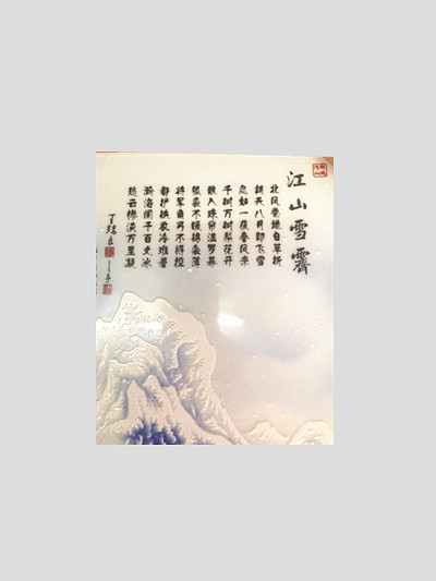 采用陶瓷绘画工艺,将雪景山水与书法艺术融合,