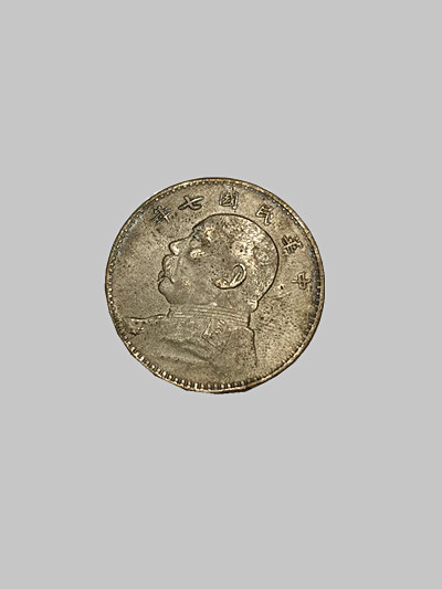 民国初年为统一货币体系发行,正面为袁世凯侧面肖像,上方铸“中华民国七年”字样。