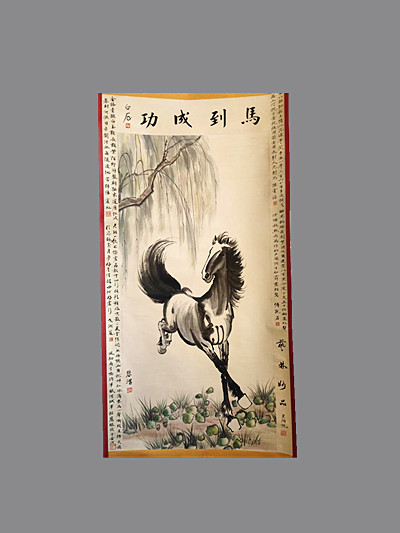 - 配景与题款:马旁衬以垂柳、草石,画面上方有“马到成功”四字题匾(落款“白石”),左右两侧辅以多段题诗(包含“悲鸿”等落款及印章)。