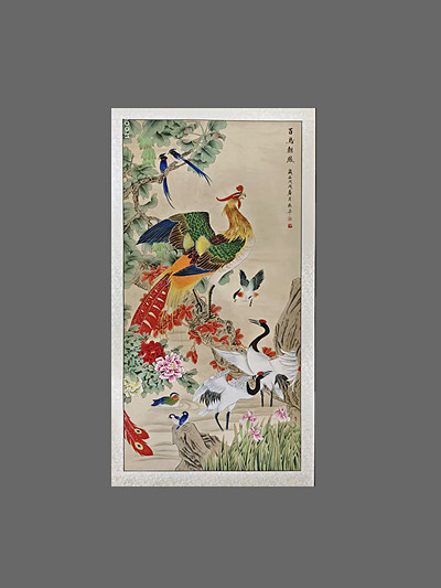“百鸟朝凤” 是中国传统艺术中极具文化内涵的题材,象征 “天下归一、盛世祥和”。画中凤凰作为百鸟之王,统领各类禽鸟(仙鹤寓意长寿、绶带鸟象征官运亨通、鸳鸯代表爱情美满),搭配牡丹(富贵)、荷花(高洁)等花卉,将自然生态与吉祥寓意深度融合,是对中国传统 “瑞应文化” 的生动诠释,具有深厚的文化研究与审美传播价值。