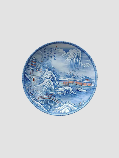 意境营造上,作品遵循传统山水画 “三远法” 构图,近景的亭台楼阁、中景的山峦雪景、远景的云雾留白,层次分明且气韵连贯,营造出 “江山雪霁,天地澄明” 的空灵意境,将中国文人寄情山水的精神追求具象化于瓷盘之上。