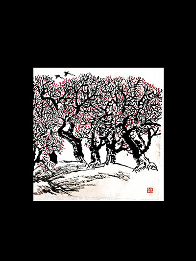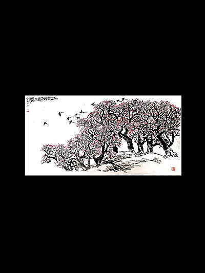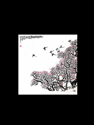 该作品以 “红杏枝头春意闹”(宋祁词中名句)为主题,用浓墨枯笔写枝干,线条苍劲老辣、交错纵横,尽显树木的遒劲姿态;再以点染法绘粉红花苞,疏密错落间烘托出 “春意闹” 的繁盛感;右侧群鸟展翅的动态,更让画面充满生机,完美呼应了 “闹” 的意境。