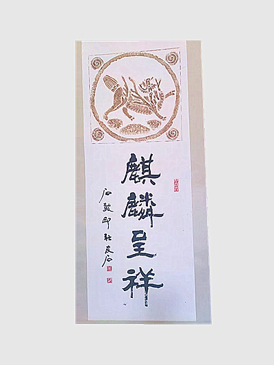 上部拓片:取汉画像石风格的麒麟纹样,圆框裹挟神兽身姿,麟角昂扬、鳞爪劲健,足底祥云暗合 “呈祥” 题旨;四角卷云纹勾连秦汉石刻的朴拙气象,拓印的斑驳肌理如岁月凝痕,既藏金石古味,又显灵动感。