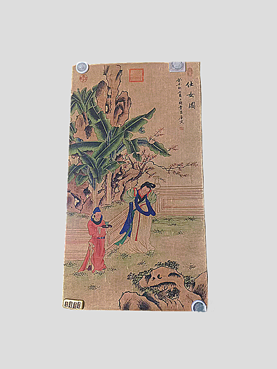 场景意境:背景以苍劲石峰、繁茂芭蕉、点染红梅构建出 “幽庭深院” 的空间 —— 芭蕉叶阔如伞,既衬出仕女的纤柔,又暗合 “雨打芭蕉” 的文人诗意;石峰皴法刚劲,红梅疏枝点蕊,与仕女的柔美形成刚柔对照,留白处似有秋风轻拂,让画面在工致中透出空灵悠远的意境。