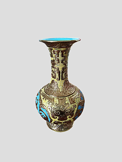 釉彩:地釉采用仿铜釉 / 古铜彩,以铁、锰等矿物为着色剂,经高温烧制呈现古铜质感;局部彩釉为松石绿釉 / 蓝釉(以铜为着色剂的低温釉),釉面莹润如宝石,与地釉形成色彩层次。