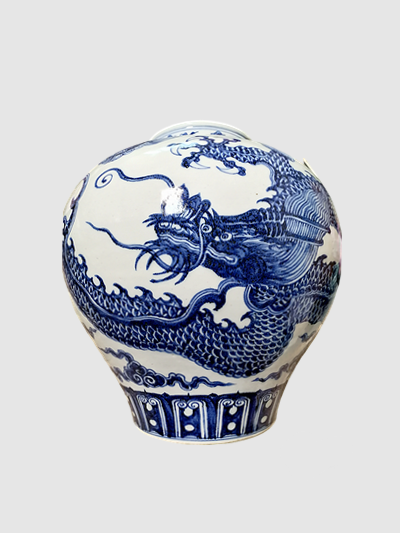 画面之上,巨龙昂首怒目,鬃毛飞张如瀑,龙鳞以细密笔触层层铺陈,纹理清晰如真,每一片鳞甲皆透着苍劲力道;龙爪遒劲如铁,锋芒隐现,似欲破壁而出,辅以缭绕祥云,或卷曲如团,或舒展如带,青花浓处沉郁如墨,淡处清雅若岚,浓淡层次间,龙的雄健威仪与云的缥缈空灵相映成趣,更衬出神兽的腾跃之势。罐身更缀瑞狮纹饰,狮首圆睁阔口,毛发卷曲如浪,与巨龙同现于器身,瑞兽相和,气象愈盛,纹饰布局疏密得宜,于有限器型间铺展开阔意境,一笔一画皆见匠心,仿佛将上古神兽的威严与祥瑞尽数凝于瓷上。