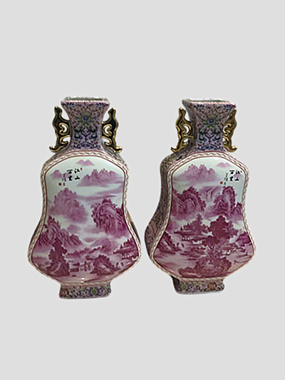 艺术价值上,此瓶是 “工” 与 “意” 的极致平衡。胭脂红山水突破了传统瓷绘的色彩桎梏,以单色釉的层次变化塑山水肌理,皴法兼工带写,既有工笔的细腻勾描,又得写意的气韵生动;器型装饰上,颈口缠枝莲纹与瓶身山水形成 “繁简对照”,鎏金耳饰的华贵与瓷釉的清润互补,既见宫廷瓷的精致法度,又含文人瓷的逸趣品格。而 “一对” 的制式更显匠心:两瓶图景一繁一简、意境一远一近,如 “上下卷” 般呼应,是瓷艺中 “对称美学” 与 “叙事性” 的罕见结合。