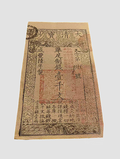 咸丰宝钞诞生于晚清风雨飘摇的乱世,是清廷为应对内忧外患所推行的货币革新产物,其票面设计堪称传统雕版印刷技艺的巅峰之作。整体以细密的云纹为底,边缘环绕着灵动的海水江崖纹样,左右两侧的双龙戏珠图案线条遒劲,龙鳞细密如织,既彰显着皇家的威严气象,又暗含 “江山永固” 的吉祥寓意。票面正中 “準足制錢壹千文” 七个楷书大字,笔力浑厚,端正庄严;左侧 “咸豐陸年製” 的纪年,右侧 “久字第 ×× 號” 的编号,与下方 “錢行用並准按成交納地丁錢糧一切稅課捐項京外各庫一概收解每錢鈔貳千文抵換官票銀壹兩” 的规制文字,共同构建起严谨的官方文书范式。那一方朱红官印色泽沉穆,印文虽历经岁月却依旧清晰,是彼时官方信用的铁证。整张宝钞的雕版线条细腻入微,纹样繁复却层次分明,每一处刀工都凝聚着清代匠人的心血,不仅是流通货币,更是一件不可多得的传统工艺珍品。它见证了晚清币制从银钱并行到纸币滥觞的艰难转型,承载着太平天国运动冲击下清廷的财政困局,其背后的金融变局与社会动荡,为我们研究晚清经济史提供了最直接的实物佐证,文化价值厚重如山。