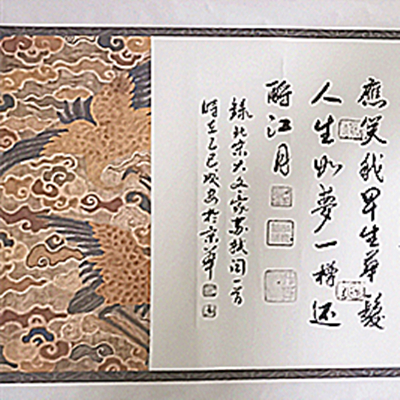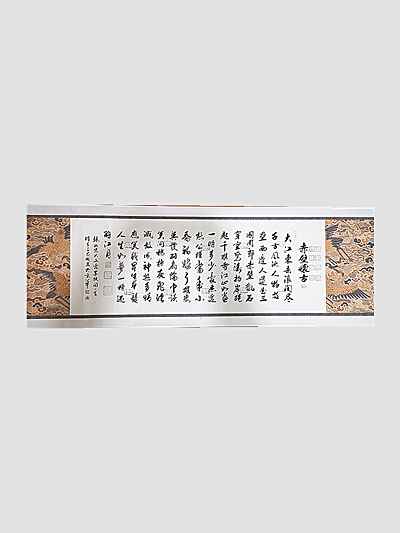 此幅《念奴娇・赤壁怀古》书法长卷,以苏轼千古绝唱为内容,采用行书书写,装裱典雅。整幅作品以白色宣纸为底,墨色浓淡相宜,行气连贯,笔势奔放。卷首以 “赤壁怀古” 四字开篇,笔力遒劲,气势开张;正文部分,“大江东去,浪淘尽,千古风流人物” 起句便以开阔的笔势营造出雄浑壮阔的历史感,字形大小错落,疏密有致,线条粗细变化丰富,时而如奔雷坠石,时而似流云漫步,将词中怀古之情与人生感慨表现得淋漓尽致。卷尾落款 “録北宋大文豪苏轼词一首 时在乙巳成安于京华”,并钤盖多方印章,印文朱红,与墨色相互映衬,更添古朴雅致之韵。长卷上下两端配以云锦图案的装裱面料,云纹流转,色彩沉稳,既保护了作品,又彰显了藏品的高贵品质,整体视觉效果和谐统一,尽显大家风范。