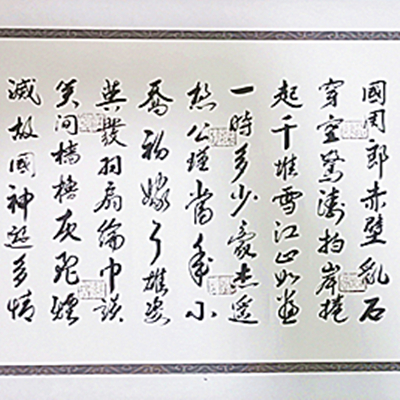 这件作品承载着深厚的文化底蕴,它以书法的形式再现了苏轼《念奴娇・赤壁怀古》的文学精髓,将宋代豪放词的雄浑气魄与中国书法的线条美感完美融合。作品不仅是对经典文学的致敬,更是对中华优秀传统文化的传承与弘扬。通过笔墨的流转,观者得以跨越时空,与千年前的苏轼进行精神对话,感受其 “人生如梦,一尊还酹江月” 的豁达襟怀与哲思智慧。在当代文化语境下,这件作品成为连接古今的桥梁,让传统文化在新时代焕发生机,对于研究中国书法史、文学史以及宋代文化精神具有重要的学术价值,同时也为后人理解中国文人的精神世界提供了生动的范本。