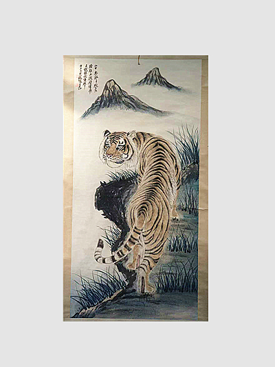 在艺术价值层面,此作尽显张善孖的精湛技艺与创新精神。他将西洋画的写实技法与中国传统笔墨精妙融合,以素描式的精准刻画虎的结构比例,又以写意之笔渲染背景氛围,达到 “形神兼备、雅俗共赏” 的艺术境界。画面线条刚柔相济,墨色层次丰富,虎身的细腻写实与山水的空灵写意形成鲜明对比,彰显出画家驾驭笔墨的深厚功力。相较于传统文人画的逸笔草草,张善孖的虎画更具视觉冲击力与生命力,开创了现代动物画的新范式,对后世画虎者影响深远,堪称中国近现代美术史上的经典范本。