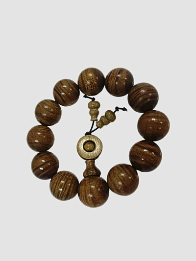 在艺术价值层面,这串手串展现了传统工艺与自然材质的完美融合。每一颗珠子都经过精细打磨,表面光滑如镜,触感细腻温润,仿佛能与肌肤呼吸共振。工匠在保留木材天然纹理的同时,通过精准的切割与抛光,让金丝楠木的光泽与纹理达到最佳呈现状态,既尊重了自然的馈赠,又以人文匠心升华了材质之美。手串的整体设计遵循 “简约而不简单” 的美学原则,圆珠的饱满形制与配饰的精巧细节相得益彰,无需过多雕琢,便将金丝楠木的天然美感发挥到极致。它既是一件可以随身佩戴的饰品,也是一件可以静心把玩的艺术品,在摩挲与观赏之间,让人领略到 “天人合一” 的东方美学精髓。