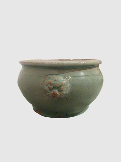 器物通体施绿釉,釉色呈现出温润柔和的豆青色,釉面布满细碎的开片纹理,这些开片是岁月在釉面留下的独特印记,纵横交错如冰裂纹,在光线折射下泛着细碎的光泽,为器物增添了古朴而细腻的质感。釉层厚薄均匀,在腹身的弧度转折处,釉色自然流淌形成深浅变化,浅处如春日新芽,深处似潭水凝碧,层次丰富而不显刻意。底部露出的胎体呈深褐色,胎质坚密厚重,与温润的绿釉形成鲜明的材质对比,更显古朴厚重。炉内素面无釉,可见胎体的原始肌理,内壁中央的一处朱红印记,似旧时藏家的识痕,为这件古物增添了一抹人文温度。
