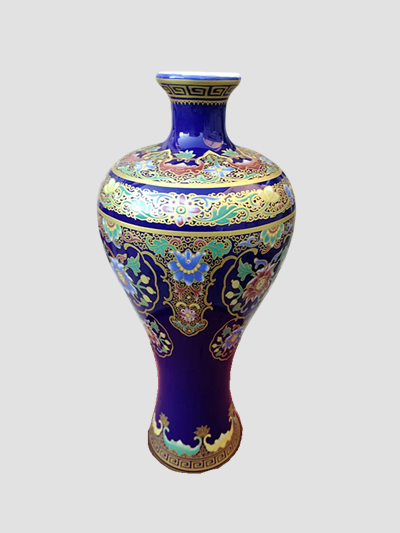瓶身装饰采用皇家御用的珐琅彩工艺,以纯金勾边,将缠枝牡丹、宝相花、西番莲等吉祥花卉铺陈于蓝釉之上。金彩线条如游丝般细腻,勾勒出花瓣的层叠肌理与叶片的舒展脉络,红、黄、蓝、绿等珐琅彩料在金框内晕染交融,色彩浓艳却不失清雅,每一瓣花都似凝露含香,每一片叶都如迎风舒展,鲜活如生的画面仿佛将春日芳菲永久定格于瓷胎之上。瓶肩处的蝙蝠纹与缠枝莲纹相映成趣,蝙蝠衔枝的纹样暗含 “福寿连绵” 的吉祥寓意,腹部开光内的折枝花卉则以 “花开富贵” 的意象传递着对美好生活的祈愿,整器纹饰布局疏密有致,从口沿的回纹到足底的如意云头纹,处处可见宫廷匠人对细节的极致追求。