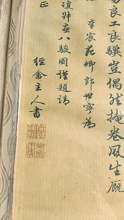 此幅郎世宁款《八骏图》,为清代宫廷艺术之巅峰杰作。跋是由善工书法绘画似果亲王爱新觉罗.胤(允)礼(康熙第十七子)所题。是中西艺术交融的不朽典范,承载着深厚的文化底蕴、卓绝的艺术造诣与无可替代的收藏价值。