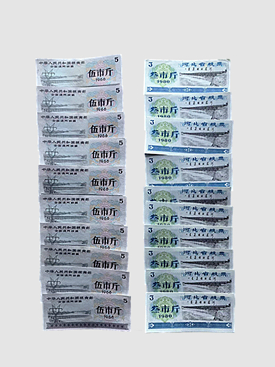 粮票作为中国计划经济时代的特殊产物,是见证社会发展与民生变迁的 “活化石”。1966 年全国通用伍市斤粮票,发行于国家大力推进工业化与农业现代化建设的关键时期,票面的电力设施、水利工程图案,直观反映了当时国家集中力量发展基础工业、改善民生的时代主题,承载着一代人艰苦奋斗、建设祖国的集体记忆。1980 年河北省叁市斤粮票,以赵州桥这一世界级文化遗产为图案,不仅彰显了河北深厚的历史文化底蕴,更体现了地方粮票在设计中对地域文化的传承与弘扬,是连接历史与现实、地域与国家的文化纽带。两套票券各 50 张的完整收藏,既展现了全国粮票的统一性与时代性,又凸显了地方粮票的地域性与独特性,共同构成了一幅生动的计划经济时期民生画卷,为研究中国近现代经济史、社会史、文化史提供了珍贵的实物佐证,其文化价值跨越时空,历久弥新。