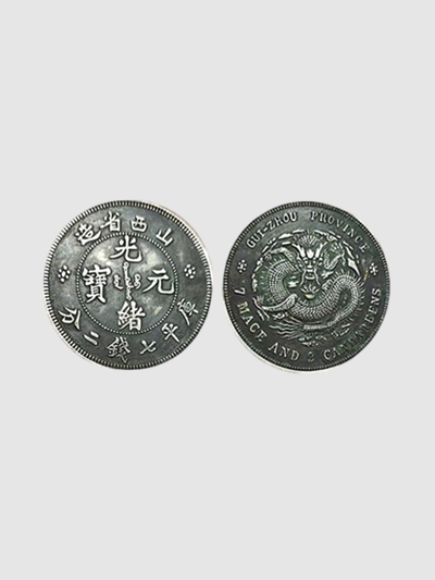 背面的龙纹图案是整枚钱币的视觉核心。五爪蟠龙身姿矫健,鳞片刻画细腻入微,每一片都层次分明,龙身盘踞间尽显威严气势。龙纹周围环绕的英文 “SHANXI PROVINCE” 与 “7 MACE AND 2 CANDAREENS”,不仅是币值与产地的标识,更象征着晚清中国主动融入世界金融体系的尝试。龙纹作为皇权的象征,在这枚银币上被赋予了新的时代意义,它既是封建王朝的余晖,也是近代中国走向开放的见证。