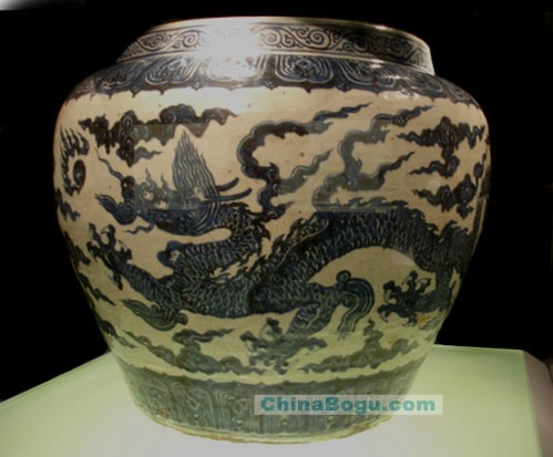 明初时期共有龙缸大窑三十二座,后因青窑数量少,龙缸窑空闲,就将其中十六座改为烧青窑。龙缸窑以烧青花双云龙宝相花缸、青花双云龙缸、青花双云龙莲瓣大缸、白瓷缸、青花四环龙戏潮水大缸、青花鱼缸、等品类。