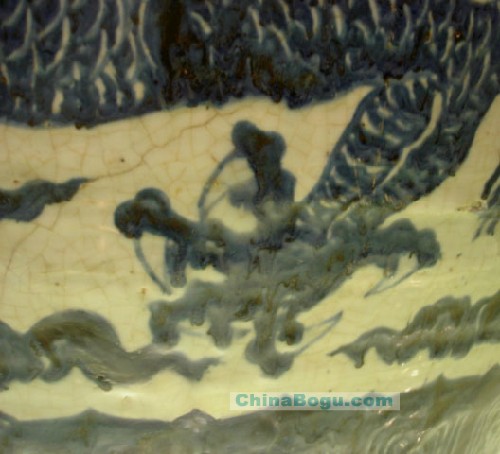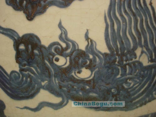青花瓷器胎质较松,釉色灰青,纹饰简单粗壮,以鱼藻,折枝花及四佛杵等花纹居多。器型有大碗、大盘等,还有少量的瓶、罐等。青花盘也有印花的,多印阳纹花卉。
