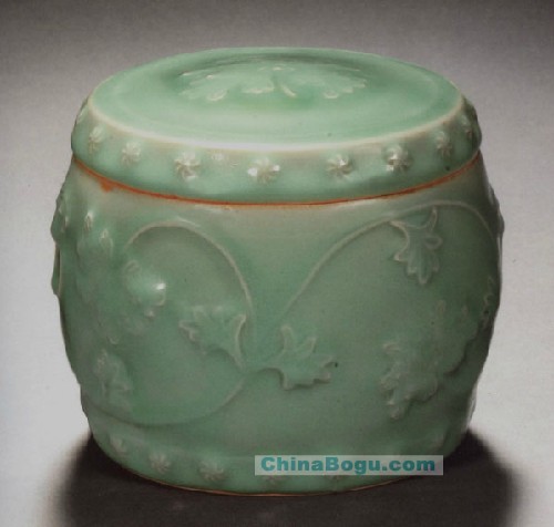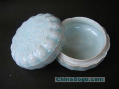 宋元时期所烧青白瓷釉色偏白,主要以刻花、蓖划纹装饰。器物中盒子多见,式样有圆式、八角式和瓜棱式等多种,盖面多印有折枝花卉纹饰。